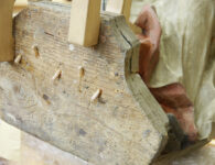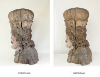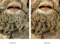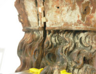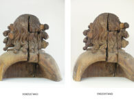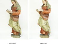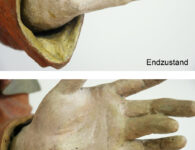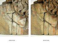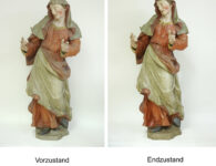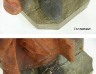 Durchgeführte Maßnahmen:Reinigung Vorder- und Rückseite der Holzplastiken mittels nebelfeuchtem Schwamm und Aqua dest. sowie Shellsol TFestigung der Fassung mit GlutinleimKlebung von lockeren Einzelteilen mit KnochenleimSchließen von tiefen Rissen im Holz mit Schnüren und KnochenleimEntfernen oder Überfassen von industriellen NägelnRetusche von weiß heraus blitzenden KreidegrundrestenAuftrag eines Schutzfirnisses aus Dammarharz gelöst in Balsamterpentinöl