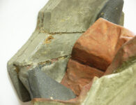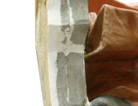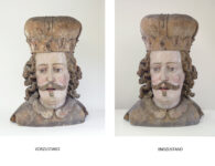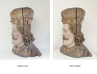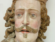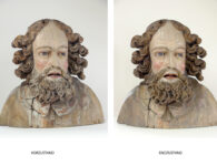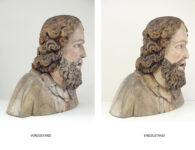 Objekt polychrom gefasste Fragmente von zwei kolossalen Holzplastikenkurze Beschreibung Kirchenpatrone des ehem. Hochaltars des St. Jakob in StraubingDarstellung Hl. Jacobus und Hl. TiburtiusMaterial Ausgehöhlte Holzplastik, die aus mehreren Teilen zusammengesetzt wurde, polychrom gefasstTechnik vermutl. Temperafassung im Inkarnat und Haare. Polimentvergoldung im Gewand und KroneMasse Hl. Jacobus: 71,5 cm x 78 cm x 50 cm; Hl. Tiburtius: 73 cm x 85 cm x 58 cmKünstler unbekannt, vermutl. StraubingDatierung um 1660 - 1670Auftraggeber Gäubodenmuseum in StraubingBearbeitungszeitraum 09.09.2024 – 03.04.2025Anlass und Ziel der Maßnahmen Beide Fragmente (Köpfe) sind leicht verschmutzt. Manche Einzelteile, aus denen die Figuren zusammengesetzt sind, sind locker. Die partiell erhaltene Vergoldung muss gefestigt werden. In vielen Bereichen verstärken die weißen Kreidegrundreste den Eindruck der fragmentarisch erhaltenen Fassung. Alte Retuschen im Inkarnat sind zu dunkel. Ziel der Maßnahmen sind die Konservierung der Fassung und der Holzskulpturen, die Korrektur der alten Retuschen und die Entfernung von industriell hergestellten Nägeln, mit denen zuvor Einzelteile fixiert wurden.
