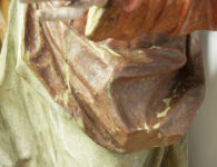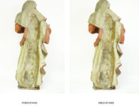 Objekt polychrom gefasste HolzskulpturDarstellung vermutl. eine Personifikation, original Hände fehlen (ebenso die dazu gehörigen Attribute).Ikonografie unbekanntMaterial Lindenholz , vergoldet und polychrom gefasst. Technik Mehrschichtige Original-Fassung vermutlich in Tempera mit ölhaltigen Abschlusslasuren auf grauem Stein- und weißem Kreidegrund, Polimentvergoldet.Masse 156,0 cm x 60,0 cm x 43,0 cm (ohne Reif, da beschädigt)Künstler unbekannt, vermutl. Süddeutschland, möglicherweise OberbayernDatierung vermutl. Anfang 18. Jh.Eigentumer PrivatbesitzAuftraggeber privatBearbeitungszeitraum Juli 2019 – März 2021Anlass und Ziel der Maßnahmen Anlass der Maßnahmen sind zahlreiche Fehlstellen und gelockerte Fassungsschollen insbesondere am Saumbereich, dort wo die Vergoldung ist. Es fehlen der Reif (Kopfschmuck am Kopf), die Hände und ein zweiter Zehe am rechten Fuß. Darüber hinaus ist festzustellen, dass alle restlichen Zehen am linken Fuß (mit Ausnahme des kleinen Zehen) und der große Zehe am rechten Fuß eine spätere Ergänzung sind. Ein Attribut, welche die Figur vermutl. in den Händen trug, ist ebenso nicht vorhanden. Der Sockel wie auch der Reif weisen von unten Spuren eines starken Insektenbefalls auf, welcher mittlerweile inaktiv ist. Zudem ist das Erscheinungsbild der Figur sehr dunkel.