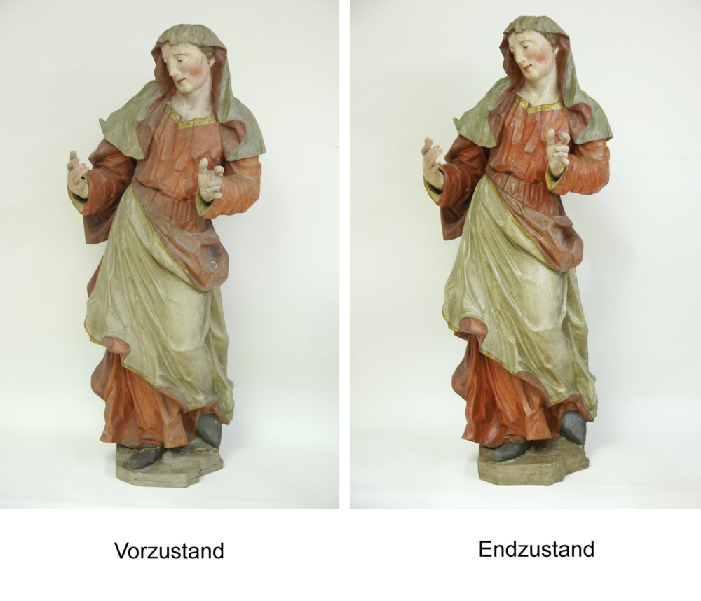 Durchgeführte Maßnahmen:Voruntersuchung mit Anlegen von FreilegungstreppenFassungsfestigung mit GlutinleimFassungsreinigung, feucht mit nicht ionischem TensidEntfernen von festsitzendem Schmutz mit einem LösungsmittelgemischHolzergänzung und Rekonstruktion von Reif (Diadem), Zehen und SockelRißschließung am HolzträgerSchließen der Fehlstellen mit Kreidegrund und KittAusführung von GravurenRetusche von FehlstellenPolimentvergoldung an FehlstellenAuftrag eines SchutzüberzugesSockel mit Filz ausgekleidet