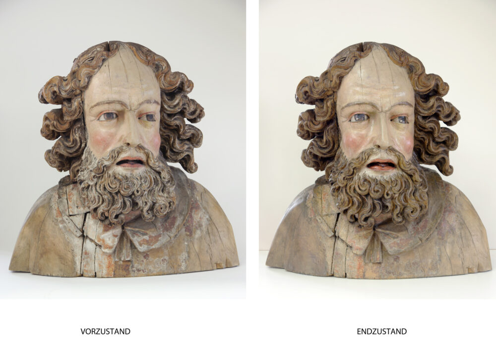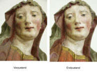 Durchgeführte Maßnahmen:Festigung der schollenartig wegstehenden FassungReinigung der Fassung und des HolzträgersRetusche von Fehlstellen und weißem Kreidegrund ohne FassungAuftrag eines Schutzfirnisses aus Naturharz (Dammar)