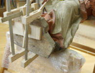Objekt polychrom gefasste HolzskulpturDarstellung Hl. AnnaMaterial Ausgehöhlte Holzplastik, die aus mehreren Teile zusammengesetzt wurde. Technik Polychrome Fassung auf Kreidegrund. Mindestens einmal überfasst.Masse 124,0 cm x 55,0 cm x 42,0 cmKünstler unbekannt, vermutl. SüddeutschlandDatierung vermutl. um 1680 - 1720Auftraggeber Gäubodenmuseum in StraubingBearbeitungszeitraum 09.09.2024 – 17.12.2024Anlass und Ziel der Maßnahmen Die Holzskulptur hat einen gebrochenen Sockel. Die Unterseite des Sockels ist zudem nicht gerade, weshalb die Figur leicht nach vorne kippt. Sie ist insgesamt verschmutzt. Die Fassung weist zahlreiche Fehlstellen mit Schollenbildung auf. Hier fehlt die Verbindung zwischen Kreidegrund und dem Holzträger. Weiße Kreiderundreste, die an den Rändern der Fehlstellen herausblitzen wirken störend. Außerdem wurde die Fassung mind. einmal vollständig oder in Teilen überfasst. Ziel der Maßnahmen ist die Konservierung der Fassung, indem Reinigungs- und Festigungsmaßnahmen durchgeführt werden. Der ursprünglich aufgedoppelte Sockel sollte wieder gefestigt, tiefe Risse sollten geschlossen werden. Restauratorisch sind nur Retuschen angedacht, die störende Kreidegrundreste an Fehlstellen eintönen.